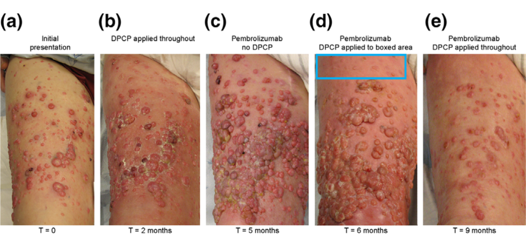 Topical DPCP added to background pembrolizumab therapy, first to a select area for one month (Panel d), and then throughout the area for an additional three months (Panel e), led to dramatic regression of cutaneous melanoma metastases.